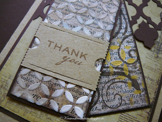 Die Blätter im Hintergrund sind mit einer Schablone und Distress Ink *Stormy Sky* gestaltet. Dafür eignet sich auch wunderbar das Negativ eines Stanzmotivs.